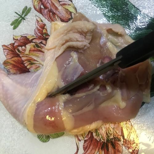 3、雞腿洗乾淨,雞肉不用切成塊,但是要垂直方向劃幾刀,這樣烹飪時也能更加入味,雞肉也會變得更松。
