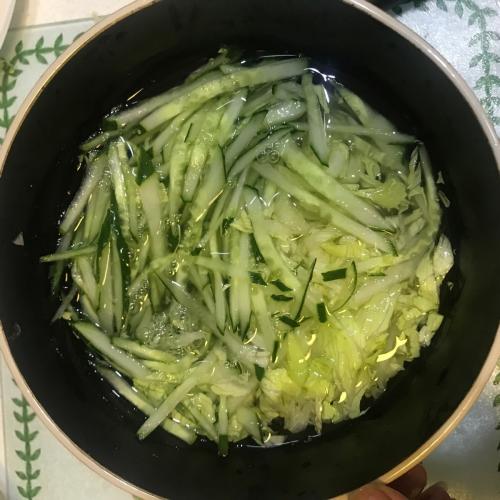 2、圓生菜洗乾淨切成絲,黃瓜洗好切成絲,這兩種蔬菜切好之後放在冰水裡面,要冰鎮一下備用。