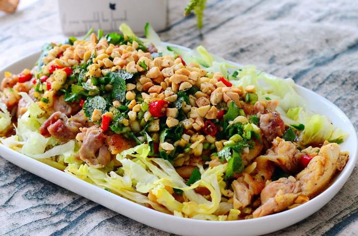 配料:雞腿,圓生菜,檸檬,黃瓜,指天椒,香菜,香蔥,熟花生仁,黑胡椒粉,醬油,海鹽,米醋,香油,大蒜等