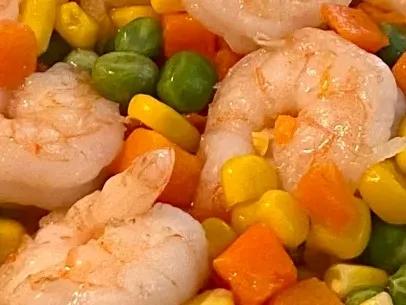 蝦仁,胡蘿蔔,玉米粒,豌豆,薑絲。