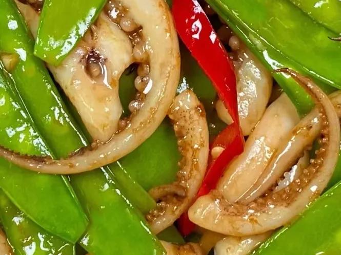 魷魚,荷蘭豆,小米辣,薑片,蒜末。