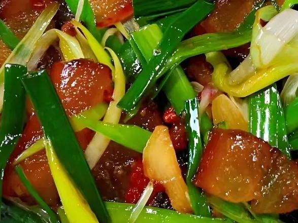 - 然後放入蒜苗翻炒均勻,炒至斷生後加入食鹽、生抽調味,翻炒均勻炒至入味,即可出鍋裝盤開吃。