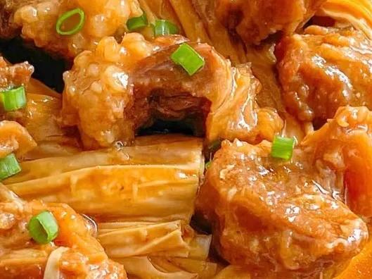 - 腐竹牛腩燜煮好了之後,開大火翻炒收汁,撒上蔥花點綴,即可出鍋裝盤。