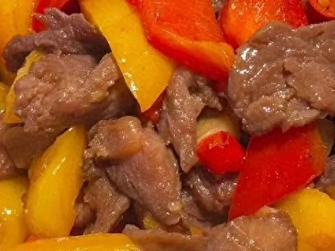 - 牛肉清洗乾淨切成薄片,放入食鹽、生抽、蠔油、老抽、胡椒粉、澱粉和食用油,抓拌均勻醃製二十分鐘。彩椒去蒂,清洗乾淨切成小塊。