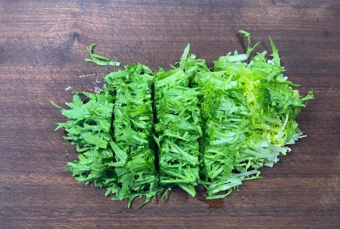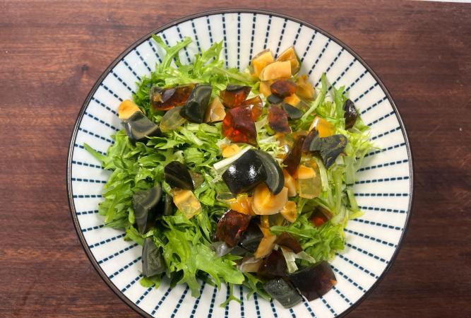 備料: 苦苣200克、皮蛋2個、生抽2勺、香醋1勺、香油半勺