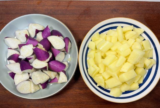 1、土豆削皮切滾刀塊,泡清水裡防氧化,茄子直接掰成小段(斷口毛毛糙糙的更吸味)。