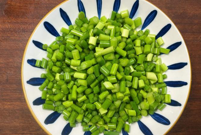 1、蒜薹切小指甲蓋大的丁(嫩蒜薹不用焯水,老的要焯10秒),肉末用料酒抓勻醃著。
