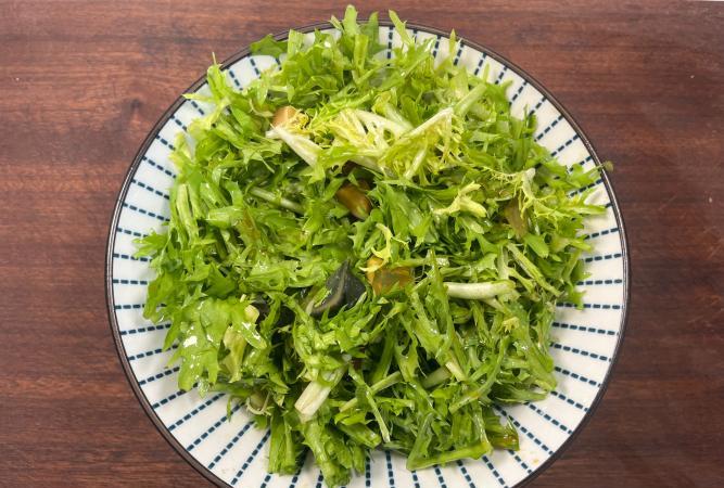 4、所有材料倒進大盆,像搖色子一樣上下顛七八下,讓每片葉子都掛上汁。