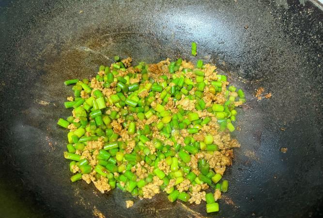 備料: 蒜薹300克、豬肉末150克、蠔油2勺、料酒1勺