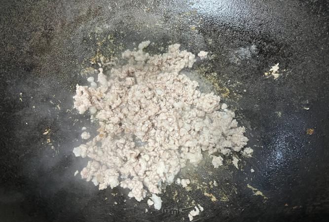 2、熱鍋涼油下肉末,中火煸到油花冒泡、肉粒焦黃,推到鍋邊。